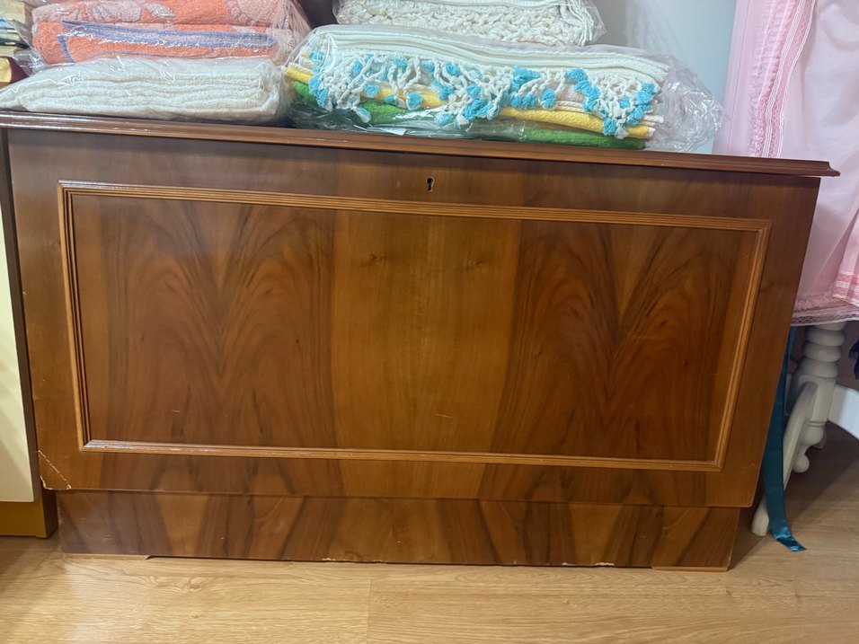 Parlak kahverengi renkte, önünde anahtarlıklı klasik tasarımlı çocuk şifonyeri.