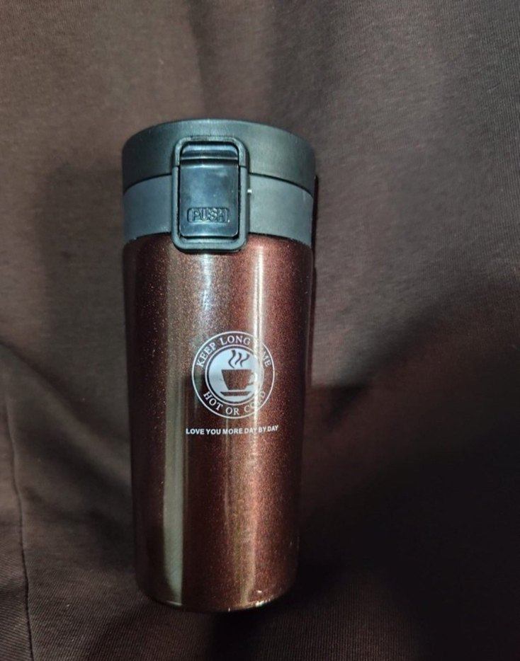 Parlak kahverengi çocuk termos, içecekleri uzun süre sıcak veya soğuk tutar. Sızdırmaz kapaklı ve taşınması kolaydır. ☕
