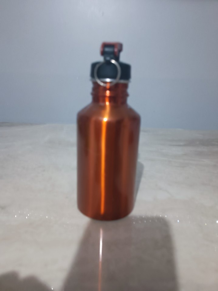 Parlak kahverengi renkte, çocuklar için kompakt tasarımlı ve taşıma halkalı termos şişe.