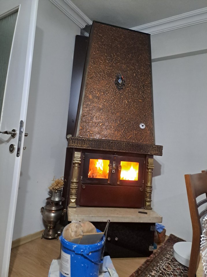 not urun balikesir ayvalık ta dır Parlak kahverengi soba, cam pencerelerle ateşi gösterir, odaya sıcaklık ve atmosfer katar. ayrıca 6 petek 1 adet havlupan dahil ürün orjinal olup kalorifer bağlantılı