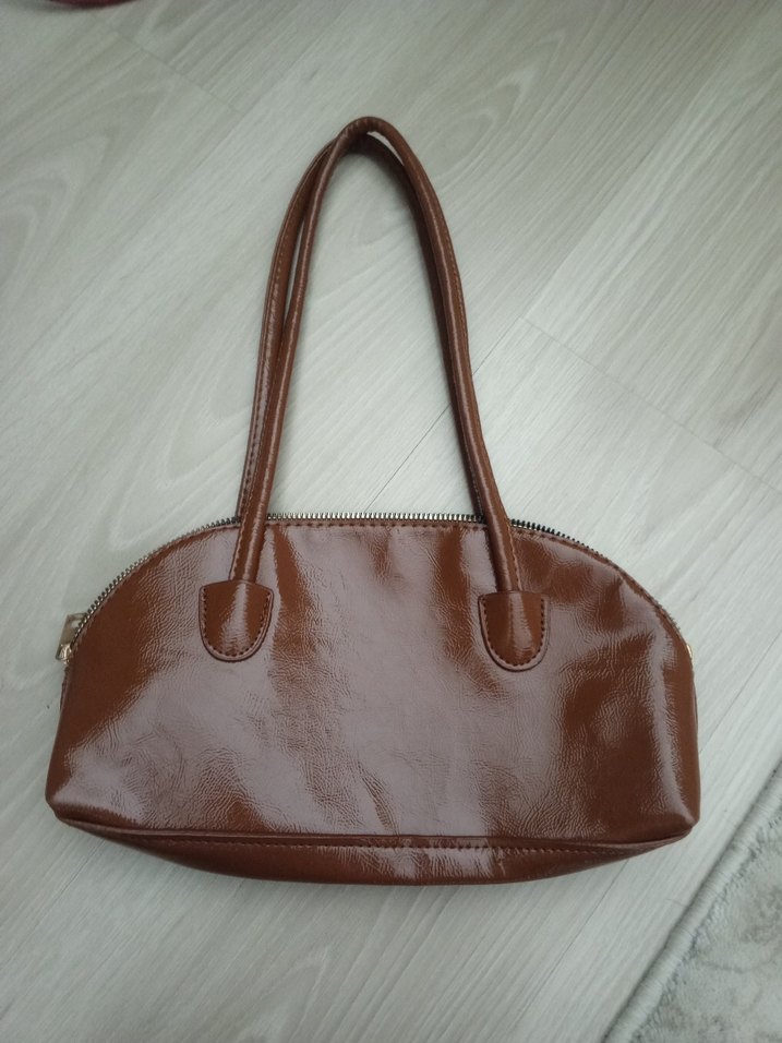 Parlak deri malzemeden yapılmış, fermuarlı, sade ve desen içermeyen bej renkli kadın çantası. Minimalist ve çağdaş tasarıma sahiptir.