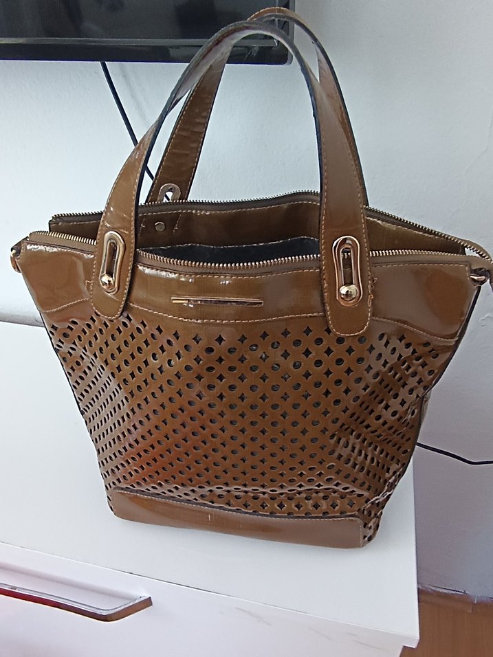 Parlak kahverengi deri kadın çanta, fermuarlı üst kısmı ve delikli tasarımıyla trend sokak stiline uygun.