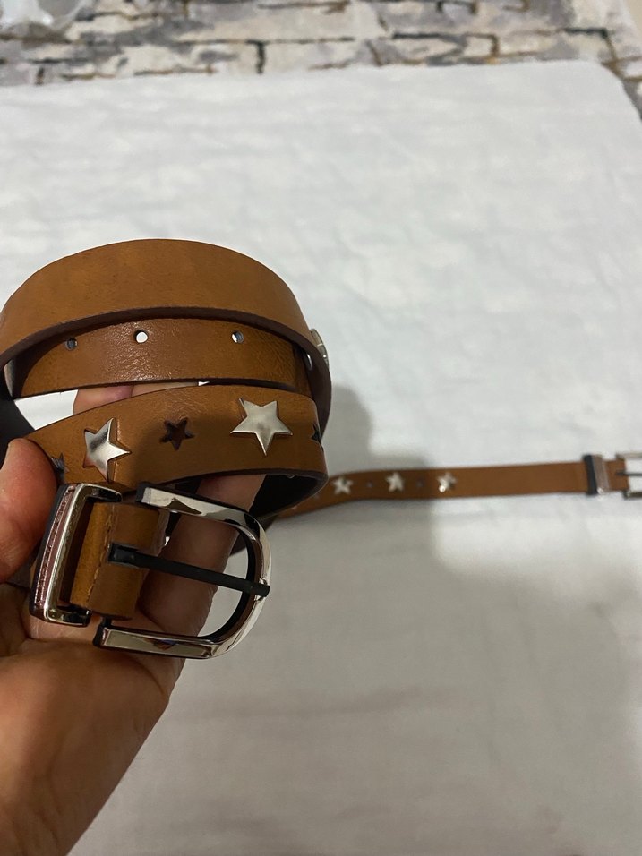 Parlak kahverengi deri kadın kemeri, yıldız şeklinde metal süslemelerle ve tokalı kapama ile rock punk tarzını yansıtıyor.⭐unisex uygundur