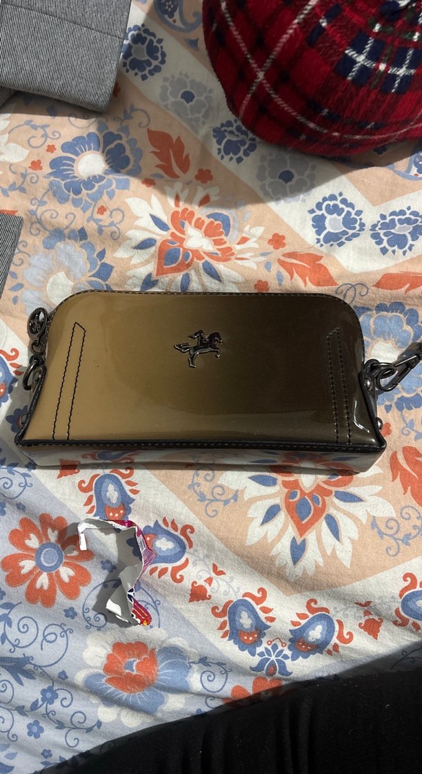 Parlak kahverengi deri kadın portföy çanta, ince baskılı desene sahip. Günlük kullanıma uygun, bohem ve retro tarzda kompakt boyut.