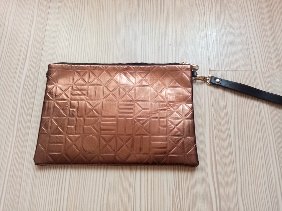 Parlak kahverengi deri portföy çanta, fermuarlı ve çağdaş kabartmalı geometrik desene sahip, minimalist moda tutkunları için ideal. Hepsi bu fiyatadır pazarlıksız