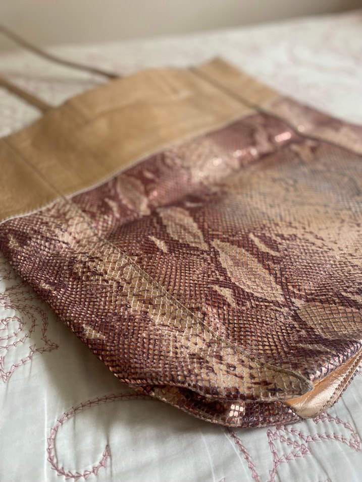Parlak yılan desenli kahverengi deri kadın çanta, fermuarlı bölmelere sahip, bohem ve Paris tarzını günlük kullanıma taşır.
