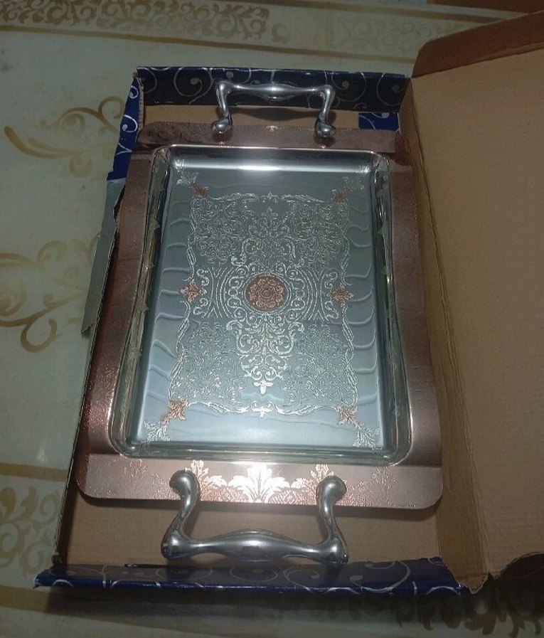Gümüş tepsi Parlak kahverengi renkli, detaylı desenlere sahip servis tepsisi, taşıma kolaylığı için sağlam kulplarla donatılmıştır. ️