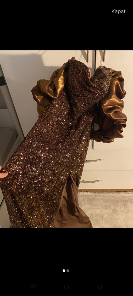 Parlak Kahverengi Drapeli Uzun Abiye Elbise