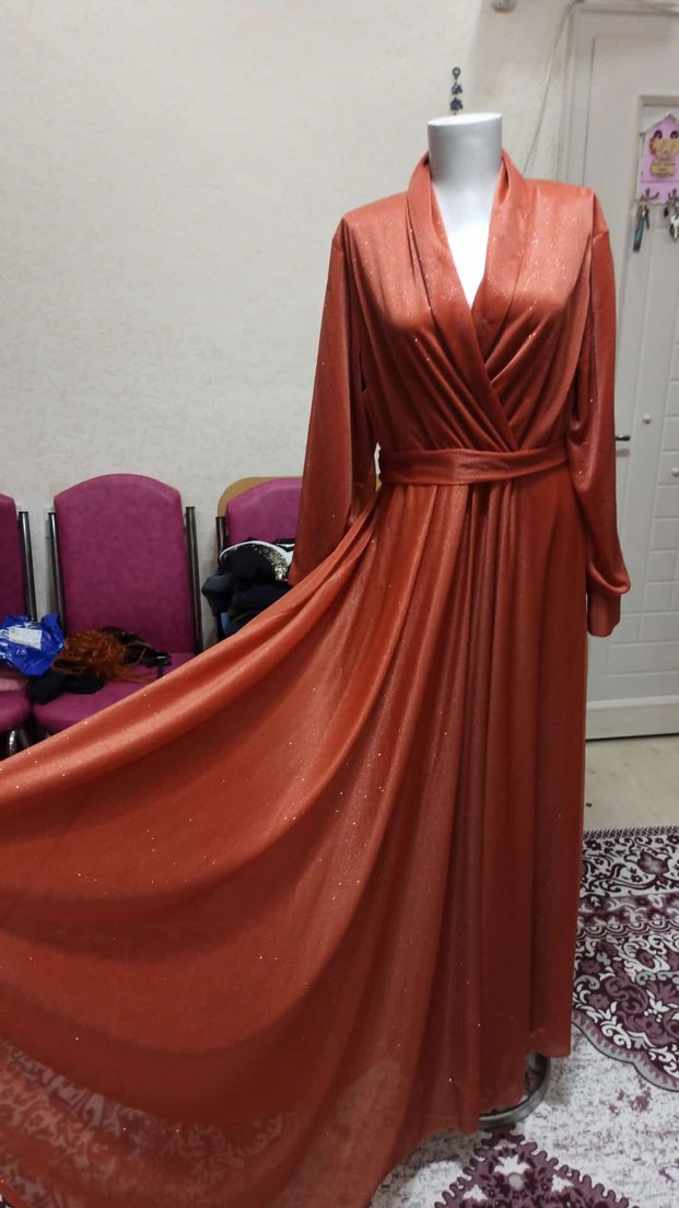 Parlak kahverengi kumaştan, drapeli ve V yakalı uzun abiye elbise. Uzun kollu, bol kesim ve desensiz yapısıyla düğünler için uygundur. ✨ simlidir