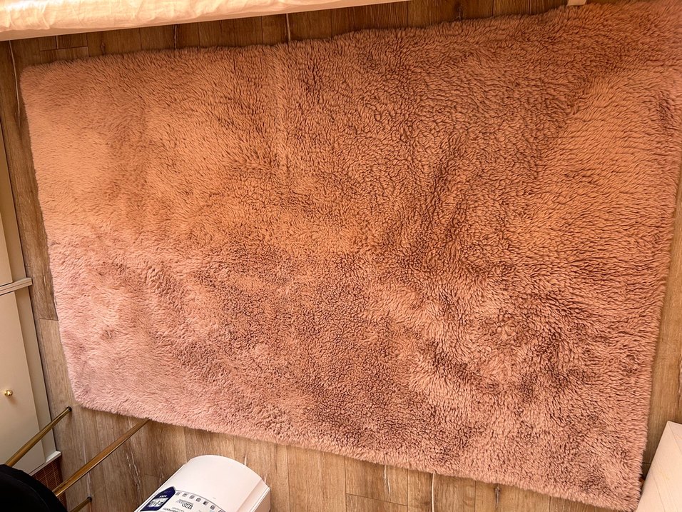 Parlak kahverengi renkte, desensiz, yumuşak ve peluş dokulu halı, mekâna sıcaklık ve konfor katar.