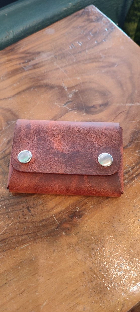 Taba kahverengi cüzdan, kartlık sade vintage tarzında, düz yüzeyli ve sağlam çıtçıtlıdır.