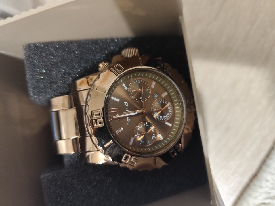Parlak kahverengi metal kayışa ve çoklu alt kadranlara sahip erkek saati, ışıltılı ve sokak tarzını birleştirir. ⌚