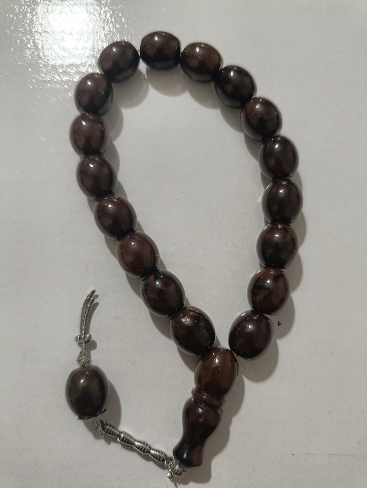 Parlak kahverengi, geleneksel tarzda erkek tesbihi, minimalist tasarımlı ve pürüzsüz, parlak boncuklardan oluşmaktadır.