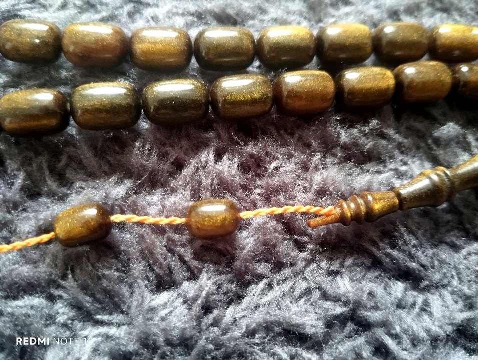 Parlak kahverengi, geleneksel tarzda erkek tesbihi. Pürüzsüz ve parlak boncuklardan oluşur, rahat bir ip üzerinde.İmamesinde hafif kusuru var