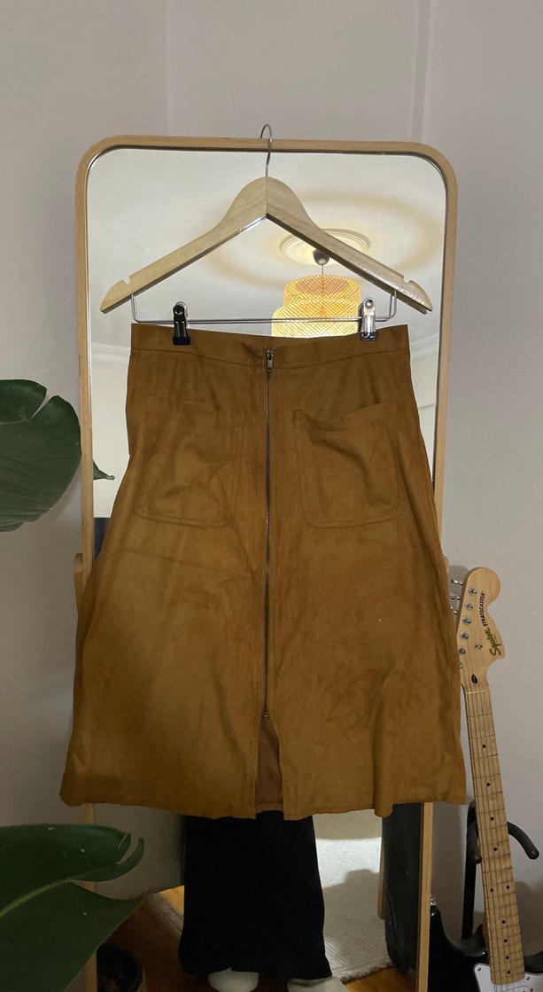 Önden fermuarlı, parlak kahverengi etek. İki ön cepli ve hafif genişleyen kesime sahip. Süet kumaşı var