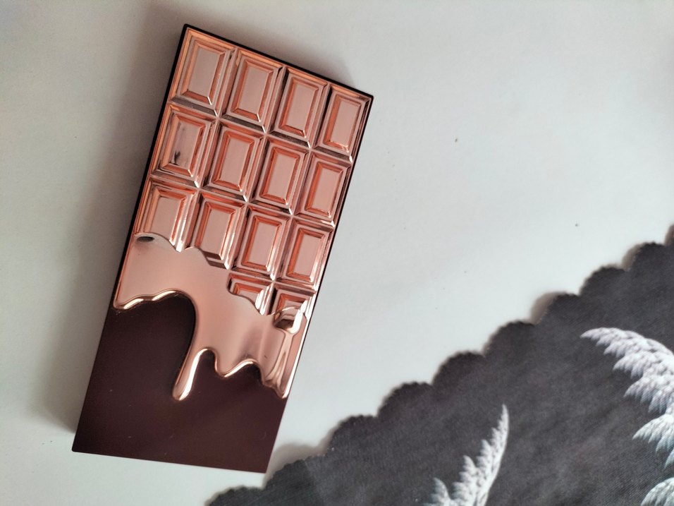 Parlak kahverengi göz farı paleti, kapağında yansıtıcı çikolata barı tasarımıyla.