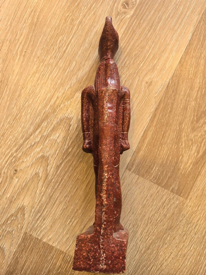 Parlak kahverengi granit figürin, ince uzun yapısı ve detaylı kollarıyla dikdörtgen taban üzerinde duruyor. kafası kırılmıştı yeniden yapıştırıldı
