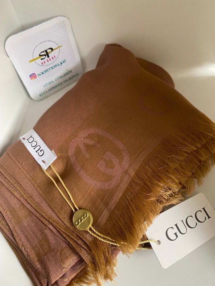 Parlak kahverengi, saten dokulu Gucci kadın şalı, püsküllü kenarları ve drapeli tasarımıyla bohem tarzı yansıtıyor. Kumaşta Gucci logosu zarifçe işlenmiştir.