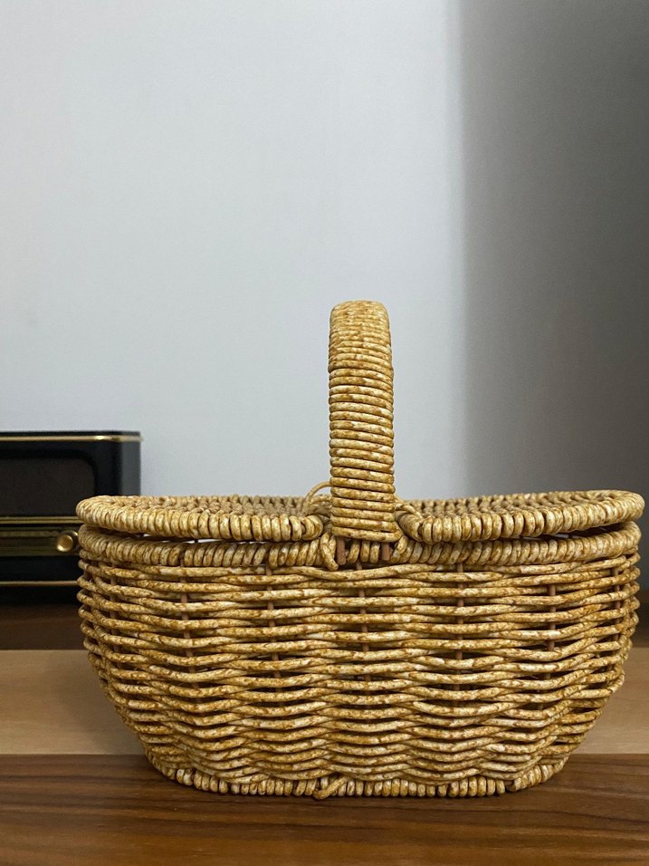 Parlak kahverengi hasır sepet, sağlam kulplu, eşyalarınızı taşımak veya depolamak için uygundur. hediye geldi fazlalıktan satılta kullanılmadı