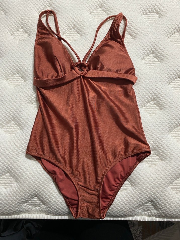 İnce askılı, parlak kahverengi kumaştan yapılmış, rahat ve şık görünümlü kadın mayo. Plaj ve sokak stiline uygun.