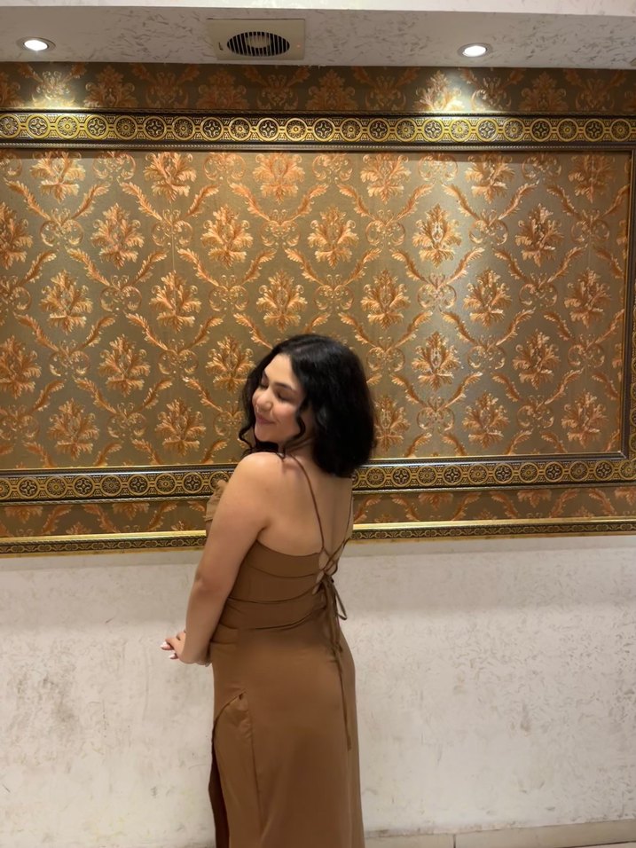 Parlak desenli, straplez ve askılı kolları olan, ipeksi kumaştan yapılmış, vücuda oturan kahverengi midi elbise. Romantik akşamlar için zahmetsiz şıklık sunar küçük bir hatası var m bedenler içinde uygundur