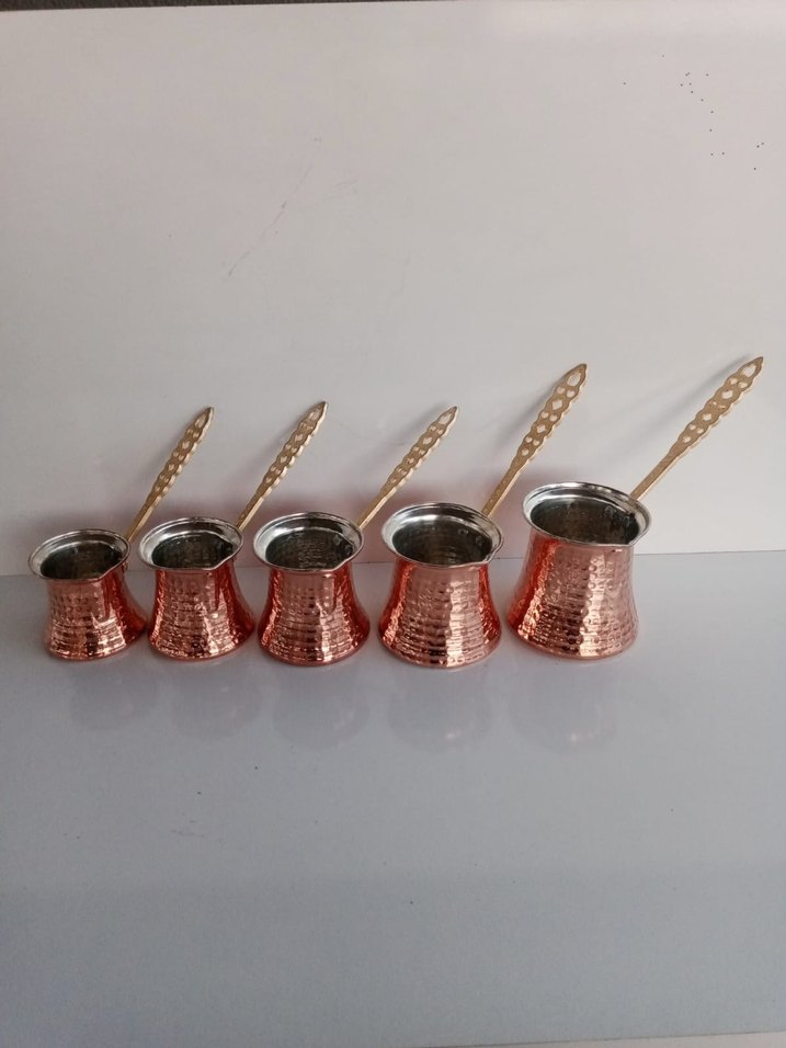 Parlak kahverengi işlemeli desenli, farklı boylarda geleneksel tarzda cezve seti. Türk kahvesi sunumu için uygun. ☕