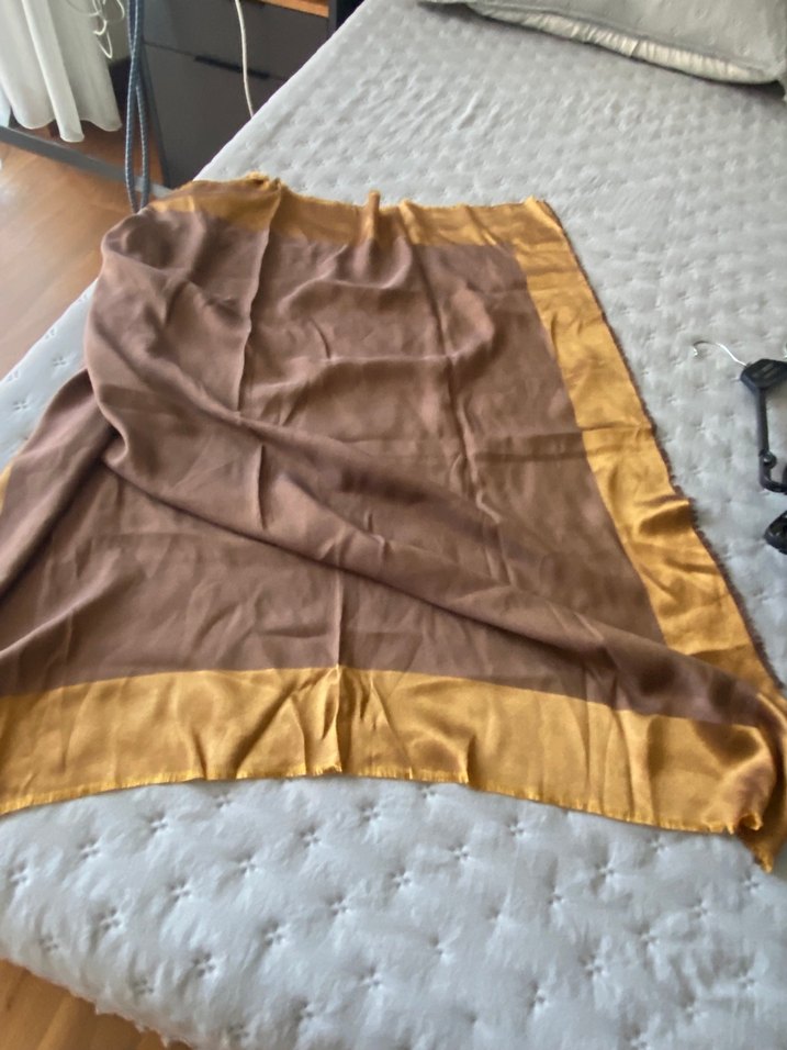 Parlak kahverengi orta kısım ve altın sarısı kenarları olan, yumuşak ve pürüzsüz kumaştan kare eşarp