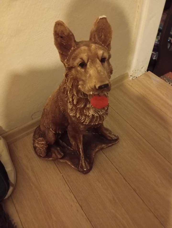 Parlak kahverengi renkte, detaylı özelliklere sahip oturan köpek figürü.