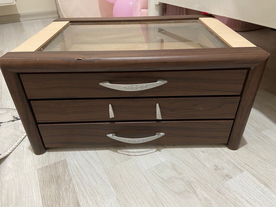 Parlak kahverengi makyaj düzenleyici, cam üst yüzey ve kolay açılan gümüş kulplara sahip çok bölmeli tasarım.