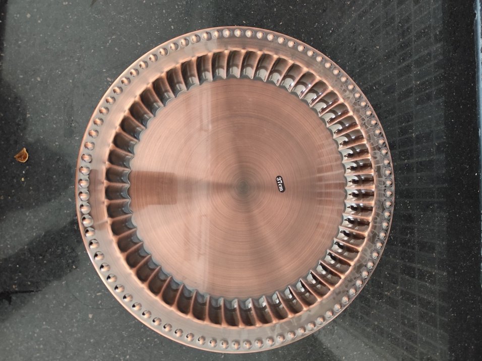 Parlak kahverengi metal tabak, düz yüzeyli ve geleneksel tasarıma sahip. Kenarında boncuklu süsleme bulunur. ️