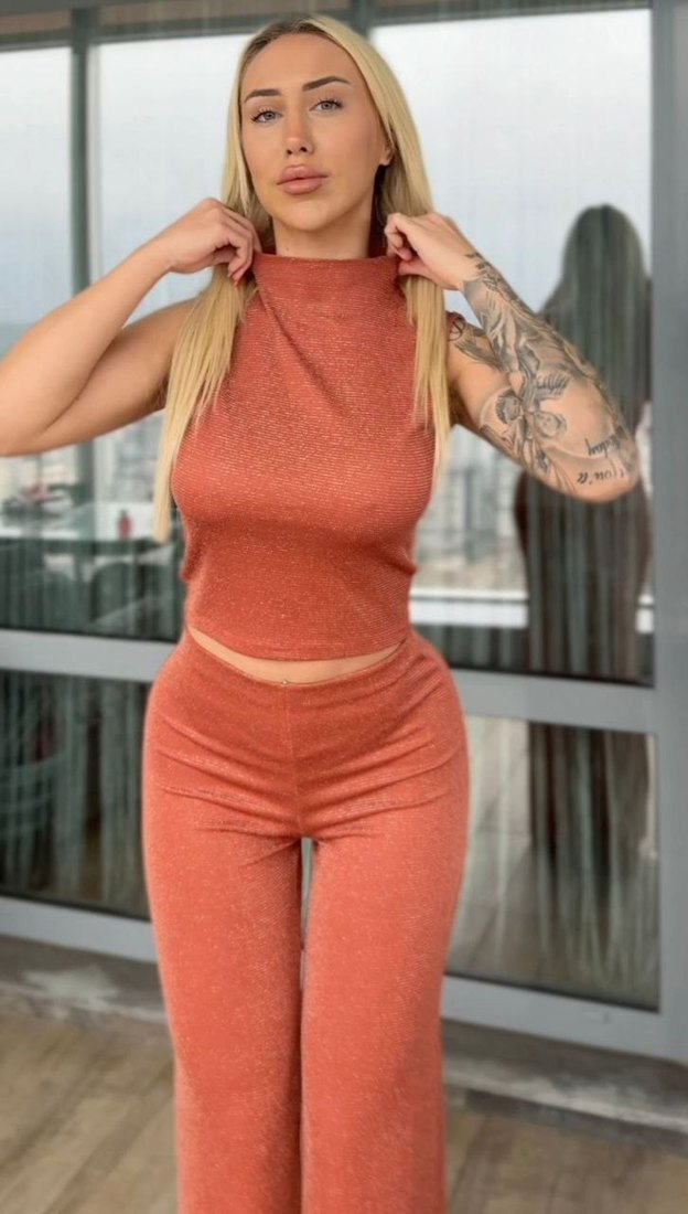 Parlak kahverengi sentetik kumaştan, yüksek yakalı ve kolsuz, kısa üst ve uyumlu pantolondan oluşan dar kesim kadın spor takımı. Rahat ve şık bir görünüm sunar. ♀️ 36 38 40 bedenleri mevcuttur
