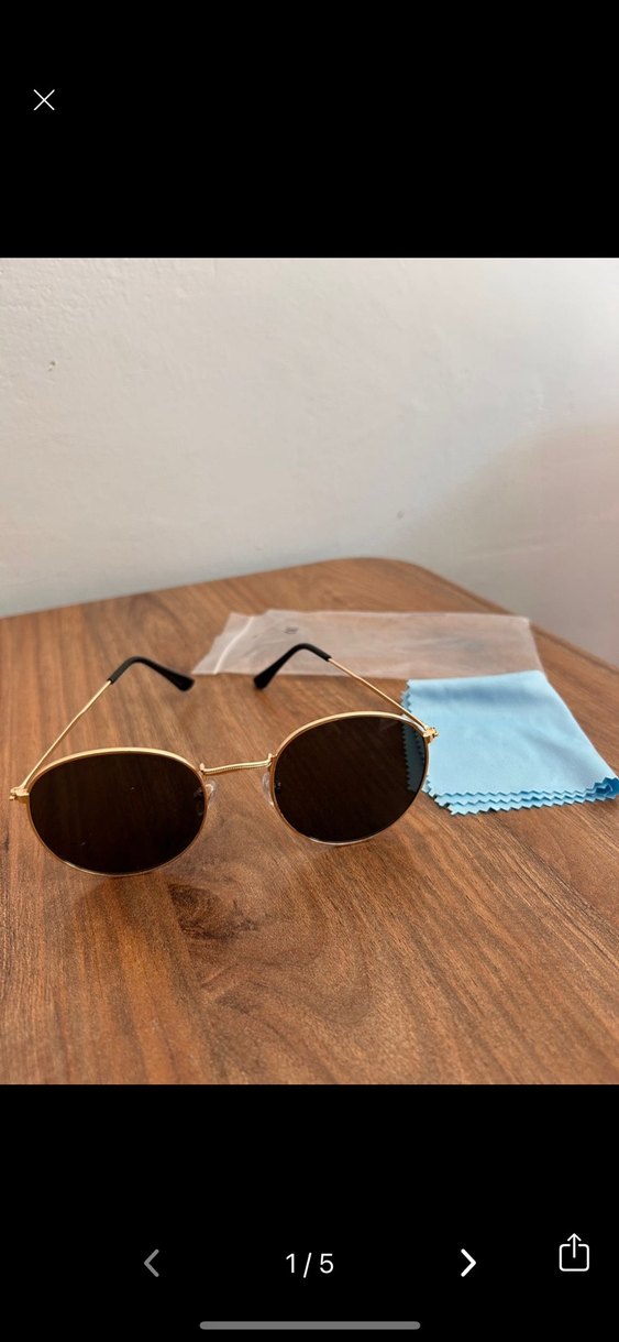 İnce altın çerçeveli, parlak kahverengi lenslere sahip minimalist kadın güneş gözlüğü. Retro ve bohem tarzı ile zahmetsiz şıklık sunar. ️kullanılmadı