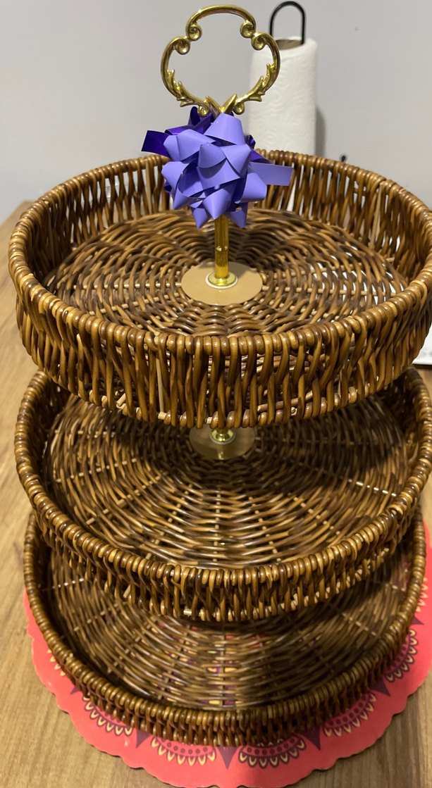 Parlak kahverengi örgü sepet, üç katmanlı tasarımıyla pratik depolama sağlar ve doğal bir görünüm sunar.