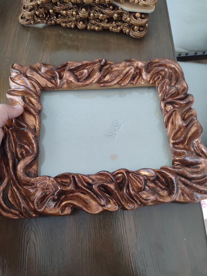Parlak kahverengi, oymalı detaylara sahip dekoratif bir çerçevedir. Dokulu yüzeyi işçiliği ön plana çıkarır. ️