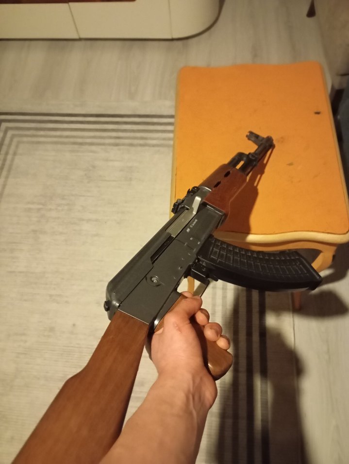 Parlak kahverengi oyuncak tüfek, detaylı tasarım ve siyah şarjörle oyun için uygun. bozuk airsofttur