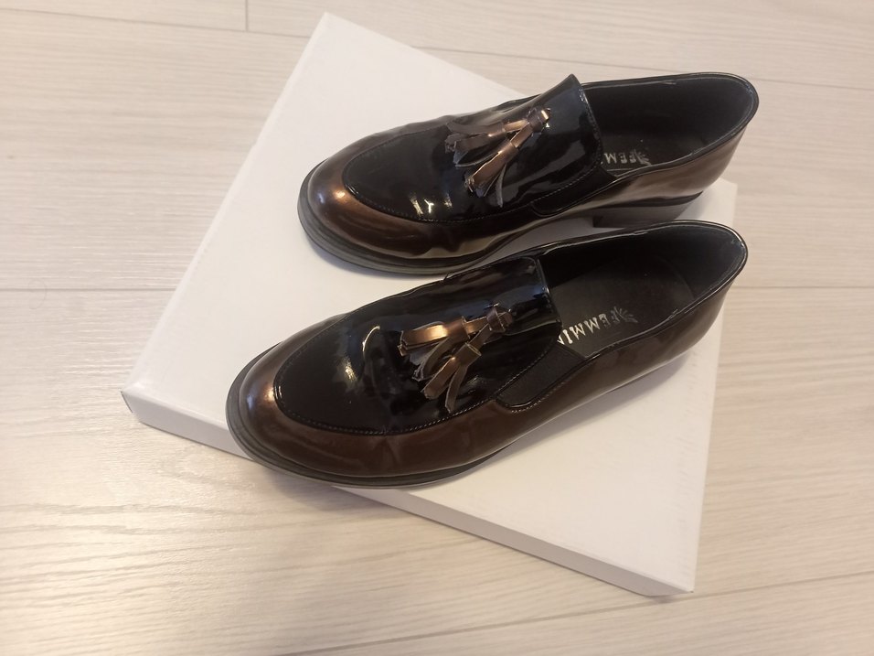 Parlak koyu kahverengi klasik ayakkabılar, blok topuk ve püsküllü detaylara sahip, Paris tarzı ve gotik stilin birleşimi, ofis için uygun.