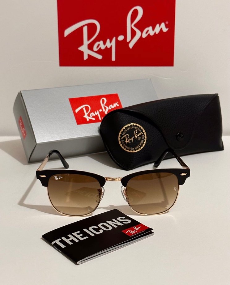 Parlak koyu kahverengi Ray-Ban unisex güneş gözlüğü, klasik sokak stilinde. Ray Ban deri kutu hediye