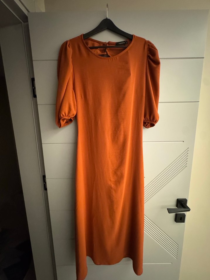 Parlak kahverengi, salaş kesim uzun elbise, drapeli kısa kollu ve yuvarlak yakalıdır. Ofis için uygun, ipeksi dokuda bir kumaştan üretilmiştir. ✨
