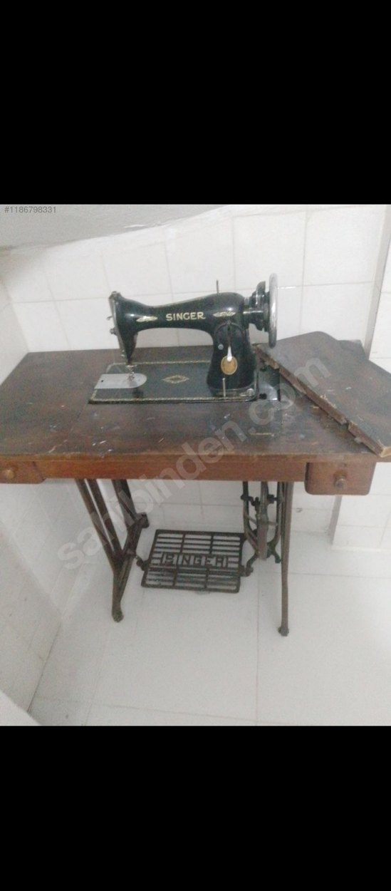 Parlak kahverengi Singer dikiş makinesi, vintage ahşap masa ve ayak pedalı ile. Klasik tasarım, çeşitli dikiş işleri için uygundur. ✂️