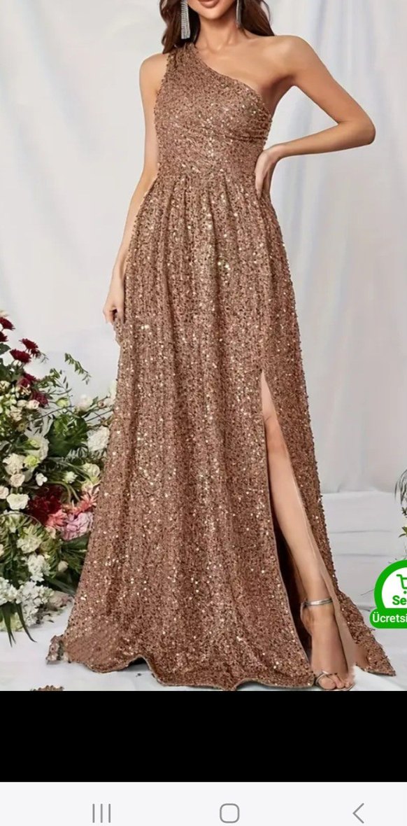 Parlak kahverengi, straplez uzun abiye elbise, bol kesim ve ışıltılı kumaşa sahiptir. Askılı kolları ve yırtmaç detayıyla bohem ve retro tarzını yansıtır.✨