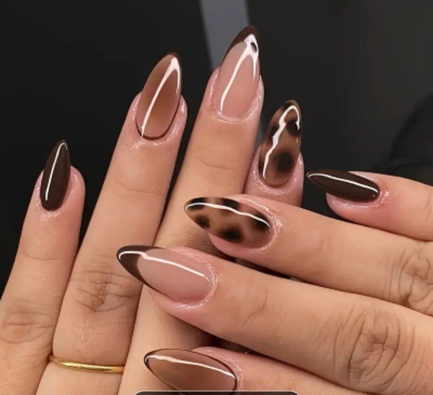 Parlak kahverengi tırnak süslemeleri, parlak yüzey ve şık desenlerle zarif bir görünüm sunar.