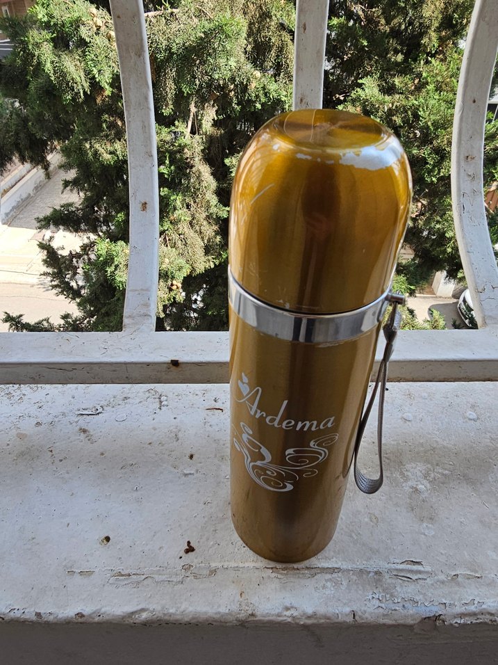 Parlak kahverengi renkte, kapaklı ve taşıma kayışlı termos Üzerinde 'Andema' yazısı bulunur. temiz kırığı vs yok