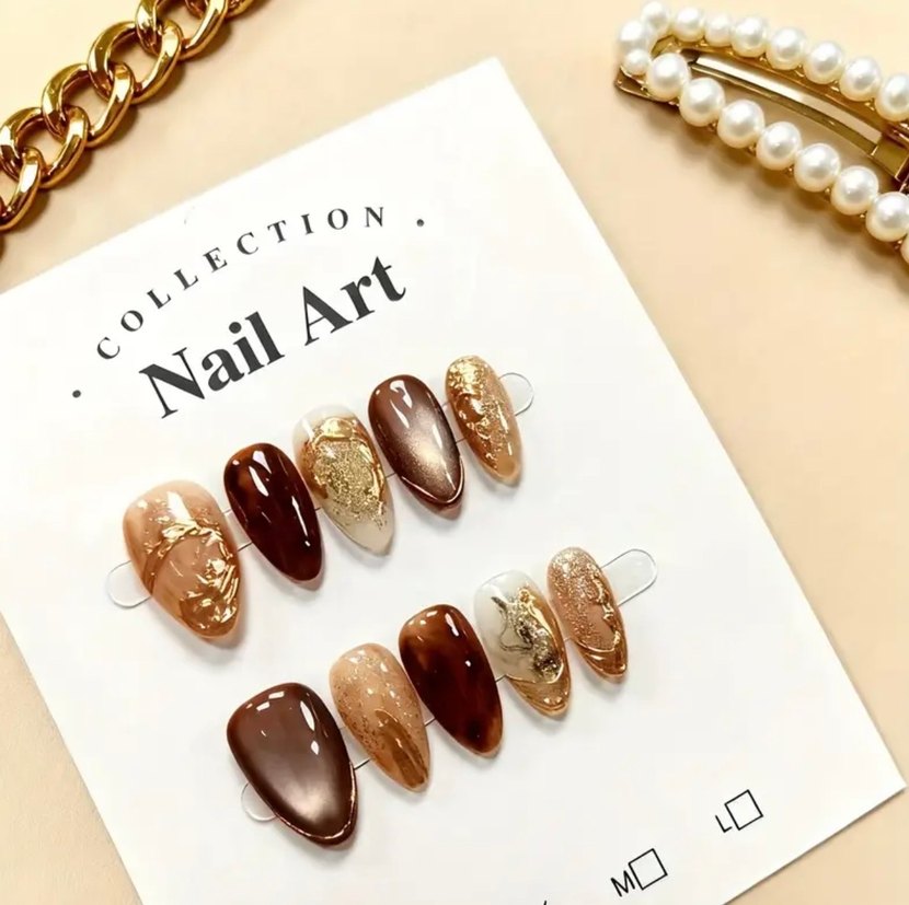 Yurtdışından sipariş üzerine getiriyorum Parlak kahverengi tonlarda, altın detaylı zarif tırnak süslemeleri. Farklı renk ve dokularla şık bir görünüm sunar.