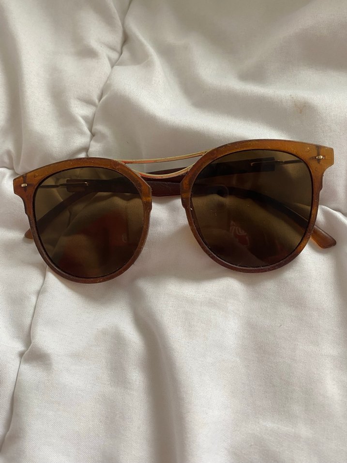 Parlak kahverengi, transparan çerçeveli, yuvarlak şekilli bohem tarzda güneş gözlüğü. Retro ve hippie görünüme uygundur. ️