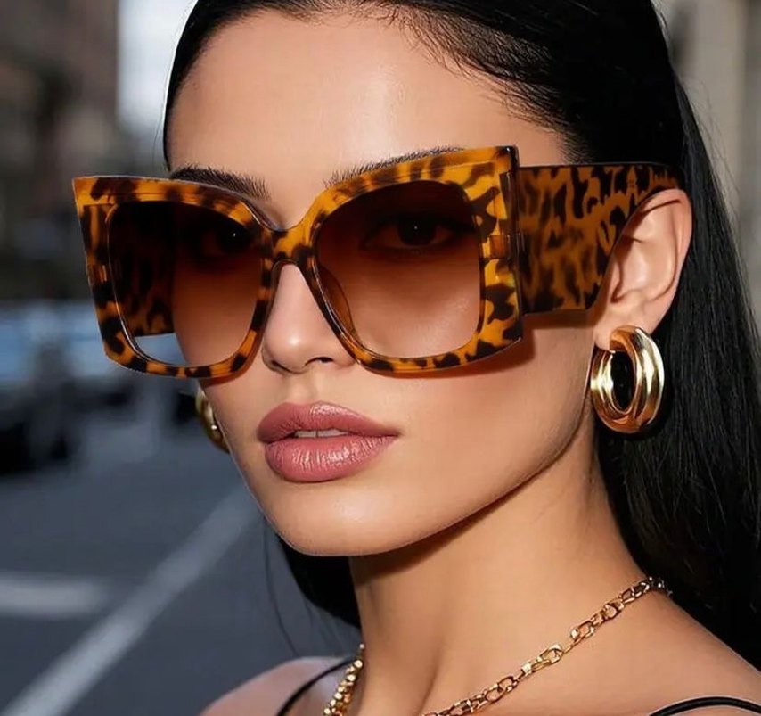 Kadınlar için parlak kahverengi, transparan detaylı, cesur tasarımlı güneş gözlüğü. Sokak modasına uygun şık bir model.