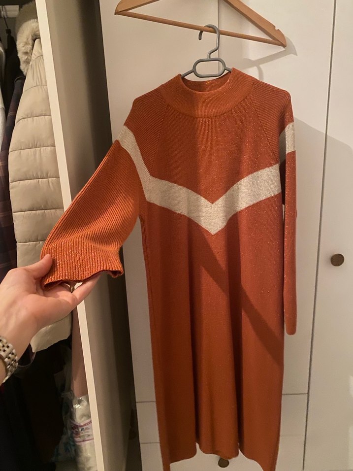 Parlak kahverengi triko elbise, yüksek yaka ve uzun kollu. Fitted kesimiyle trend ve rahat bir görünüm sunar. Midi boy ve konforlu triko kumaşla günlük kullanıma uygun. ✨