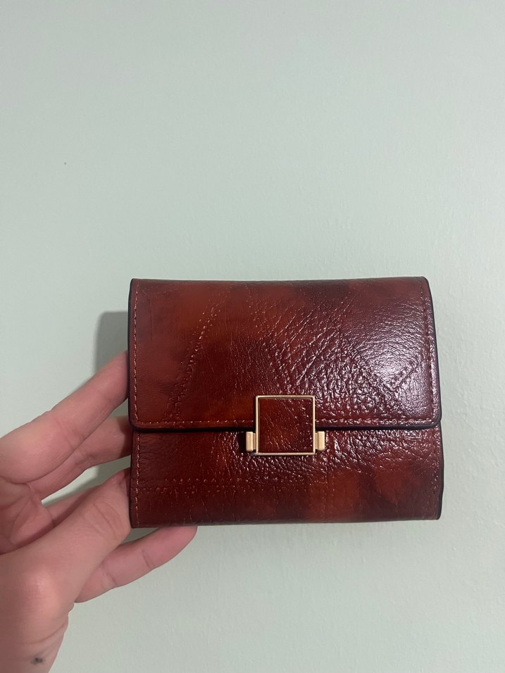 Parlak kahverengi yüzeye sahip unisex cüzdanı, desen içermeyen ve sade bir tasarıma sahiptir. Geleneksel ve minimalist tarzda bir üründür.