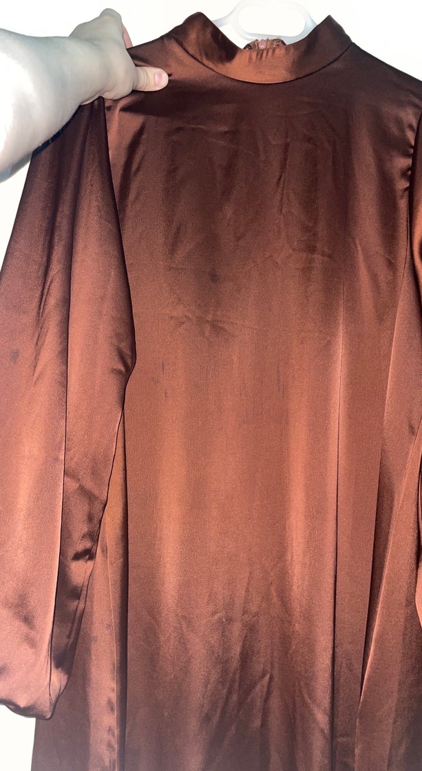 Parlak kahverengi, uzun kollu, vücuda oturan kadın abiyesi Minimalist ve bohem tarzda, desensiz ve uzun boyda.