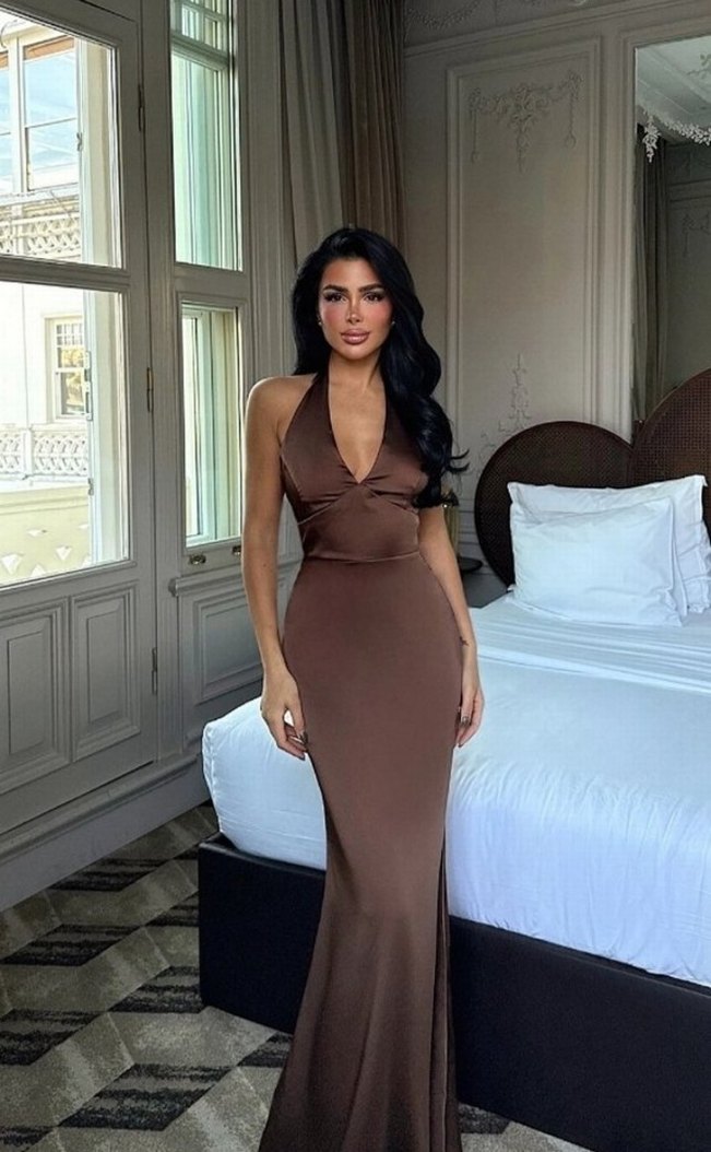 Parlak kahverengi, saten görünümlü kumaştan, drapeli ve ip askılı, v yaka uzun, dar kesim kadın elbisesi. Romantik akşamlar için uygundur.
