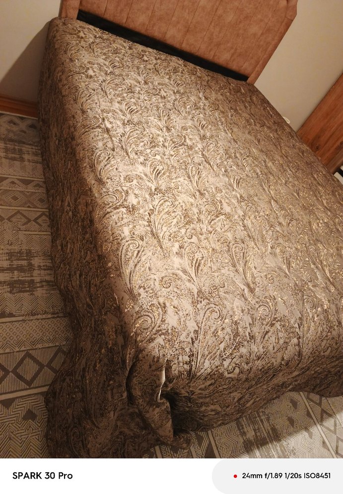 Parlak kahverengi yatak örtüsü, sade ve desen içermeyen yapısıyla yatağa zarif bir doku katıyor. Yatak odası dekorunu tamamlar. ️